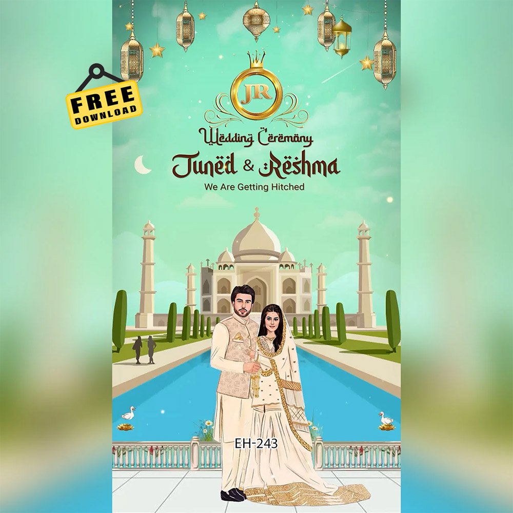 Muslim Wedding Invitation EH-243, muslim wedding invitation with beautiful couple caricature. wedding invitation vertical look for mobile friendly. this project file easily customize in adobe premiere pro 2022 and any above version.